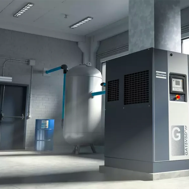 Vissa luftkompressorer är "tankmonterade", vilket innebär att de tillhandahålls som en komplett enhet och installeras ovanpå den luftmottagande tanken. Användningen av luftkompressorer av tanktyp sparar inte bara utrymme utan minskar också den initiala installationskostnaden som krävs för installation av individuella torktumlare. Denna konfiguration är mycket vanlig i små luftkompressorer, och uteffekten överstiger vanligtvis inte 26 kilowatt (eller 35 hästkrafter). Stora luftkompressorer är inte lämpliga för tankinstallationskonstruktioner eftersom detta skulle resultera i en topptung installation, vilket kan utgöra säkerhetsrisker.