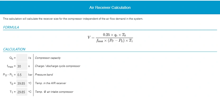Minimera tryckfluktuationer/fall: Den luftmottagande tanken används för att minimera tryckfluktuationer som kan påverka produktionsprocessen och produktkvaliteten. När du väljer rätt luftmottagande tank för din kompressor måste två värden noteras: kompressorns utgående tryck och applikationskraven vid användningsstället. Observera att den komprimerade luften som lagras i den luftmottagande tanken endast är användbar när dess tryck är tillräckligt för att stödja motsvarande process. Därför måste den tid under vilken luftmottagande tanken levererar gas vid det tryck som krävs av slutanvändaren/utrustningen (i minuter) beaktas.
