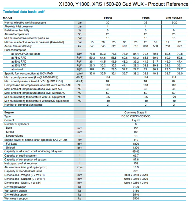 Atlas Copco X1300, Y1300 och XRS 1500-20 är tysta, tvåstegs, oljeinsprutade skruvkompressorer, drivna av vätskekyld, sexcylindrig Cummins dieselmotor.