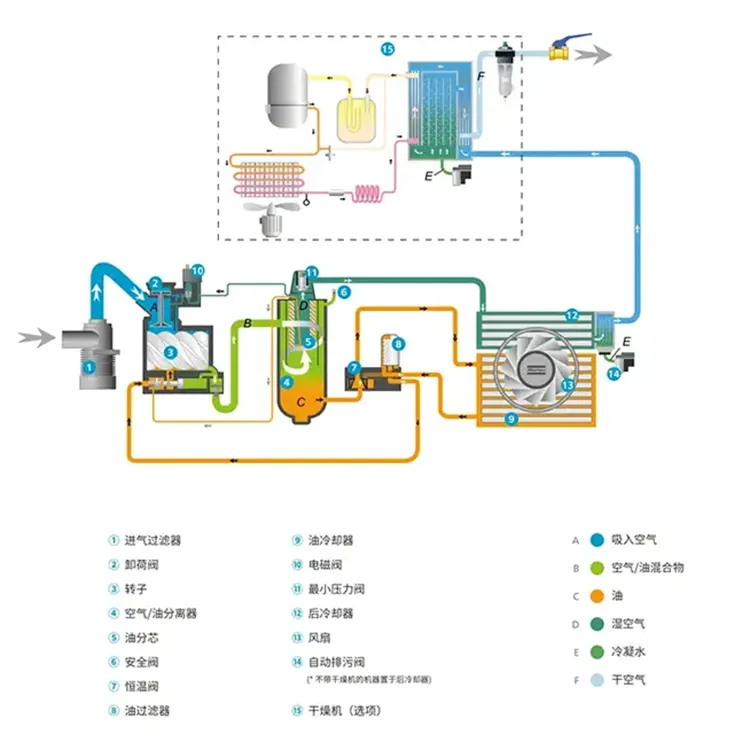 1. Startsteg: När strömbrytaren trycks in startar det elektroniska styrsystemet automatiskt luftkompressorns smörjsystem och kylvattensystem. Samtidigt öppnas insugningsventilen och luft kommer in i huvudenhetens inre.