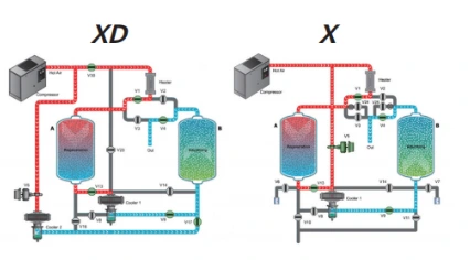 Dessutom är XD eller X kompressionsvärmetorkar verkligen noll-luftförbrukningstorkar, som förbrukar ingen energi eller bara en del av komprimerad luft under kallblåsningsfasen.