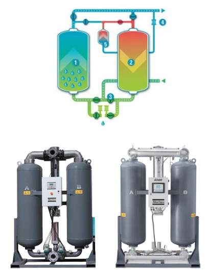 A-seriens mikrovärme regenerativa adsorptionstorkar använder ett torkmedel för att absorbera fukt från tryckluft. Varje maskin består av två identiska torn. De byter funktioner efter varje cykel.