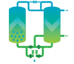 Medan ett torn är i adsorptionsläge är det andra i regenereringsläge. Regenereringsgasen kräver en viss andel färdig tryckluft.